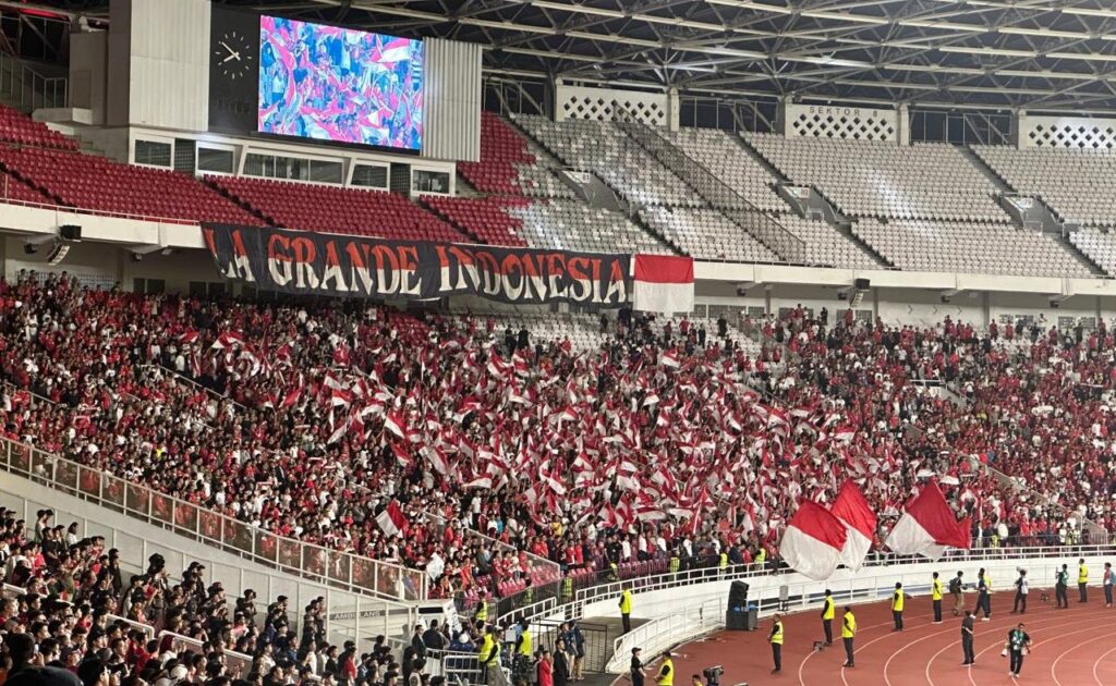Suasana tribun Stadion Utama GBK dipenuhi lautan merah putih dari ribuan suporter yang memberikan dukungan penuh kepada Tim Nasional Indonesia, menciptakan atmosfer luar biasa pada laga final FIFA Series 2026 dengan dukungan kelistrikan andal dari PLN.