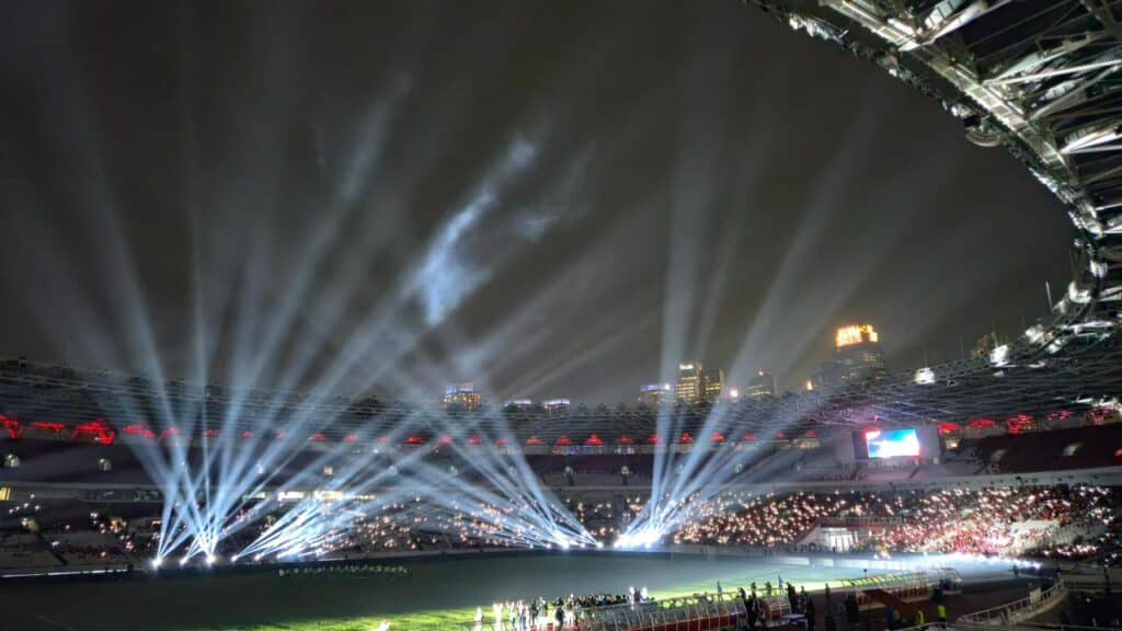 Penerangan Stadion Utama Gelora Bung Karno (GBK) menyala terang dengan dukungan sistem kelistrikan andal dari PLN. Lampu stadion dan lampu sorot (floodlight) beroperasi optimal tanpa kedip selama pertandingan final FIFA Series 2026 Indonesia vs Bulgaria.