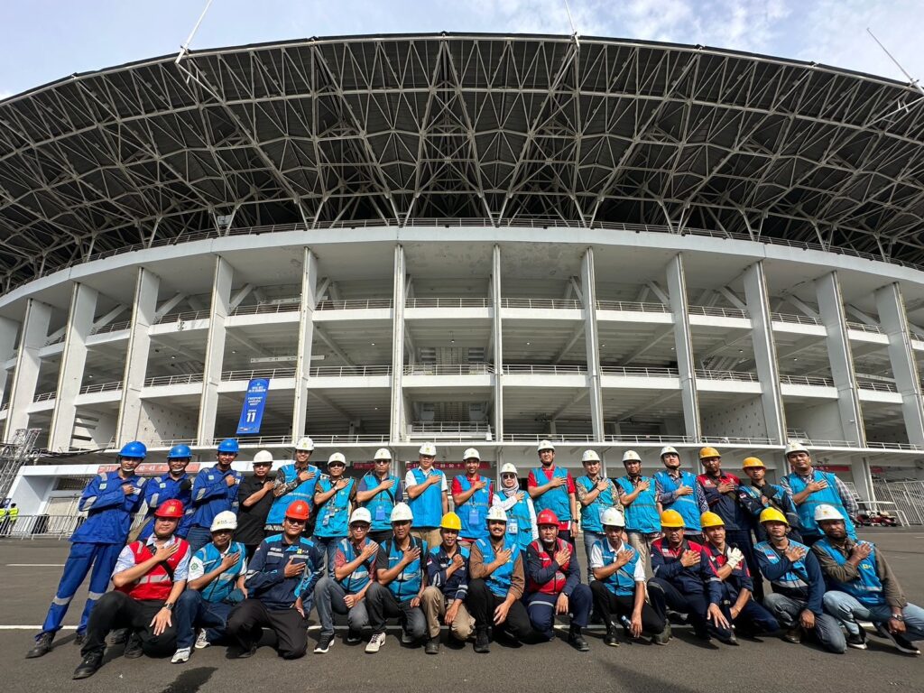 Tim PLN berfoto bersama di depan Stadion Utama GBK sebagai tim di balik layar yang memastikan keandalan pasokan listrik tanpa kedip pada pertandingan final FIFA Series 2026, mendukung suksesnya gelaran sepak bola internasional tersebut.