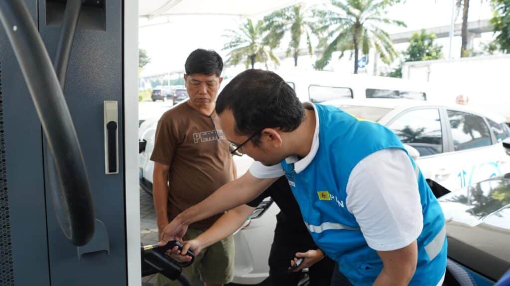 Petugas PLN UID Jakarta Raya membantu pelanggan dalam pengisian daya kendaraan listrik di Stasiun Pengisian Kendaraan Listrik Umum (SPKLU) Center yang berada di Rest Area Km.10 Cibubur selama periode Idulfitri 1447 H