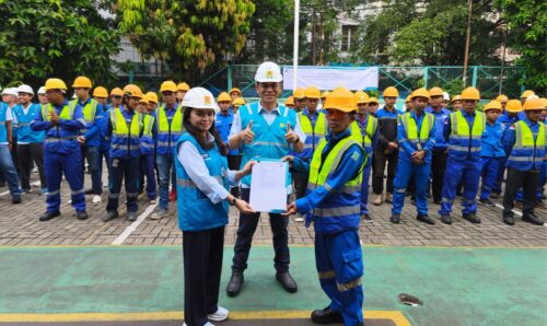 Jajaran pegawai dan petugas PLN UP3 Kebon Jeruk berfoto bersama usai pelaksanaan Apel Penyalaan Serentak pasang baru dan tambah daya bagi 1.100 pelanggan. Kegiatan ini dilaksanakan serentak di 16 unit pelayanan sebagai wujud kolaborasi dalam meningkatkan kualitas layanan.