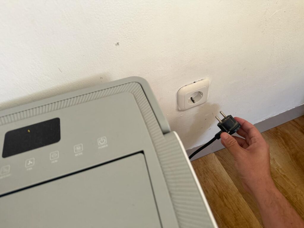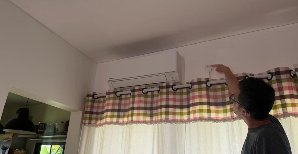 Ilustrasi seorang pelanggan mematikan dan mencabut pendingin ruangan dari stop kontak di rumah sebagai bagian dari langkah pengamanan listrik sebelum mudik, guna menjaga kondisi rumah tetap aman selama ditinggalkan.