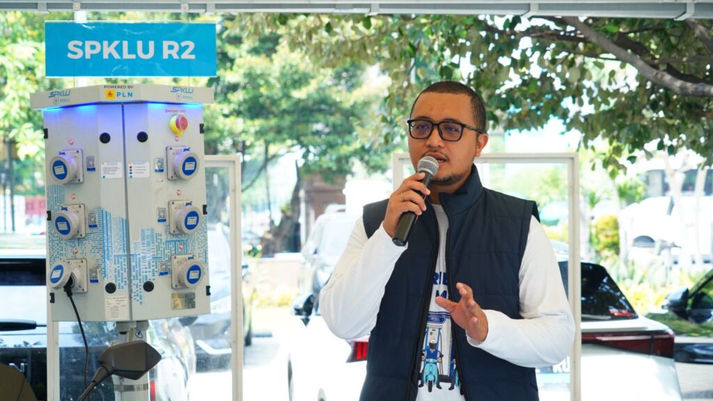 Manager Pelayanan Prioritas PLN UID Jakarta Raya, Andika Rama memberikan penjelasan teknis kepada peserta EV Rides With Media mengenai cara mengisi daya motor listrik di SPKLU R2.
